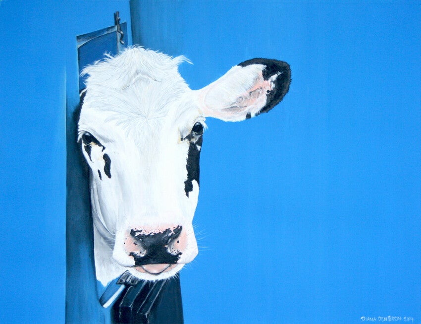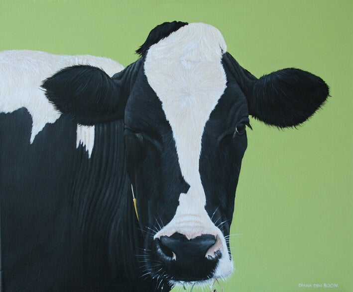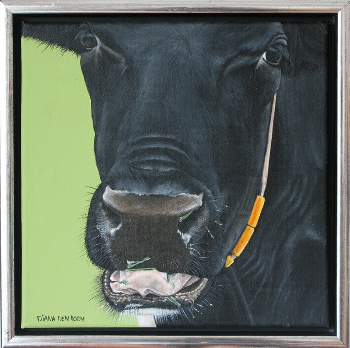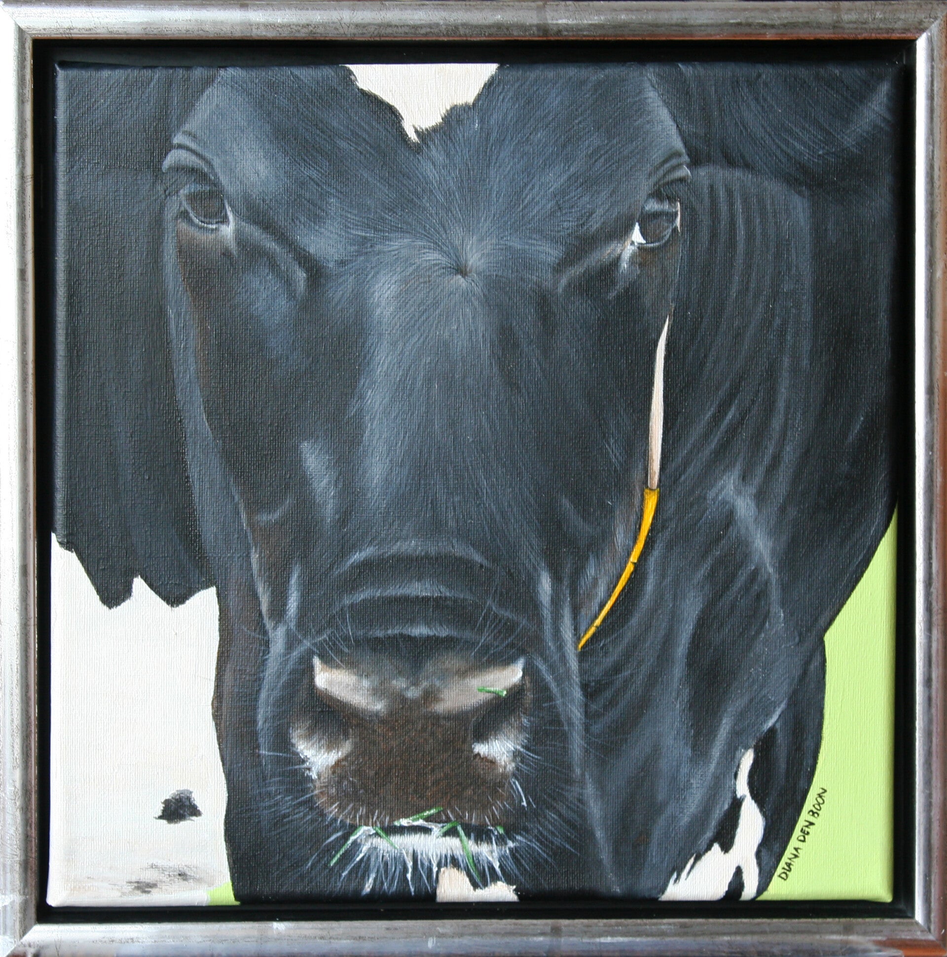 Hier presenteert zich mijn verzameling koeienschilderijen, gemaakt gedurende de afgelopen jaren. Koeien zijn werkelijk fantastische wezens, en ik geef ze graag een eigenzinnige draai met een knipoog of een gekke uitdrukking, terwijl ik toch probeer hun zachtheid te behouden. Bij voorkeur trek ik zelf het veld in om foto's te maken, waarbij de nieuwsgierigheid van de koeien ze naar me toe brengt, snuffelend en verkennend. Dit levert de meest prachtige en levendige beelden op.