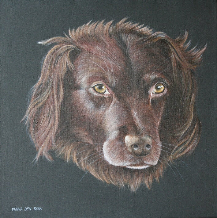 Een lief oud baasje...Eigenwijs met een lekkere uitstraling..zijn baasjes waren er helemaal blij mee, verrassend goed had ik het karakter in dit portret gekregen. Geschilderd op 40 x 40 cm canvas doek met acryl verf