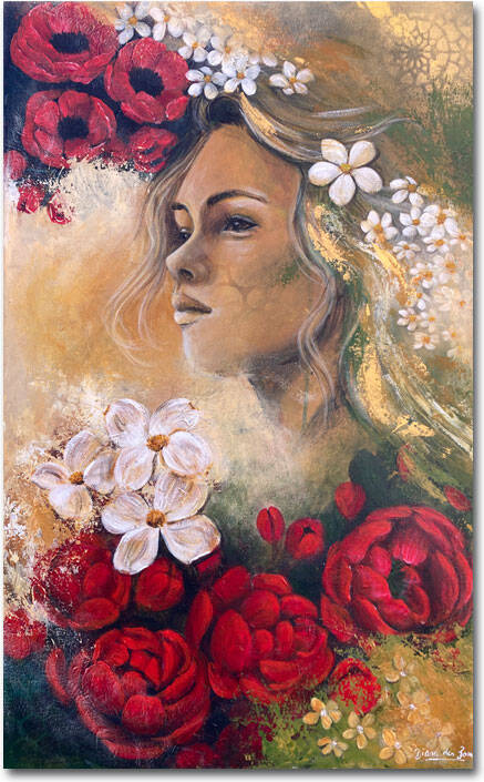 Wild Flower is voor mij een dromerige wereld — een plek die ik beetje bij beetje heb opgebouwd met mijn penseel. Het begon als een eenvoudig idee: een vrouw in een landschap vol rode bloemen, omringd door een gouden achtergrond die haar in het licht zet.